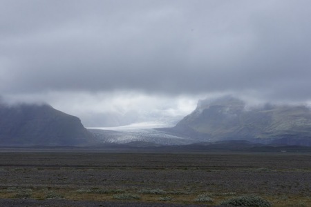The gravel road leading towards Myrdalsjokull was a winding, curvy tease; the glacier would sporadically poke out, shiny like a beacon in the moody sky, but then hide behind the hills with each new sharp turn. The only view we had from the “parking lot” (i.e. a flat space surrounded by rocks) at the end of the road were mounds of black ash, residue from thousands of years of Icelandic volcanoes volcano-ing. I looked for the highest walkable point and begun to climb. Of course at the end of that was just another black hill, so I’d take another round. An unreasonable amount of time later, I was there. It was eerie and unreal because a second earlier I was just staring at the side of a hill. The wind was still and I shivered. It was not cold. I stared down at a gigantic army of black, jagged colossi, behind whom were clearer ice, heading off an onyx trail into the distant mist.